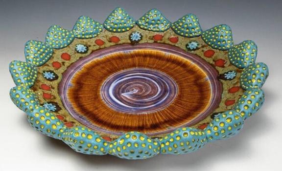 Using red earthenware clay, I layer slips, terra sigillatas, and glazes, with wax resist patterning, to create my highly decorated earthenware vessels. My work starts from a functional basis, e.g. cups, bowls, plates, but my true desire is to create overly embellished vessels that are cartoon representations of compositions that I might find lying on the forest floor, crawling across the bottom of the ocean, or hovering in space over the surface of a gas giant planet. I hope viewers and users get a sense that my pots could just slither away if they turn their gaze away for too long.